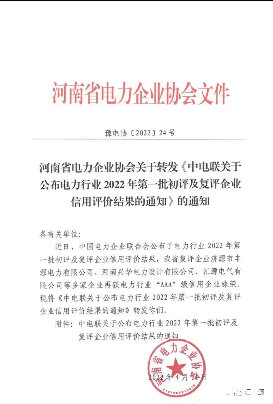 2022年4月11日,中国电力企业联合会及河南省电力企业协会电力企业信用评价工作圆满结束。经过中国电力企业联合会相关专家复评,半岛网页版登入界面再次获得“AAA”级信用建设单位。