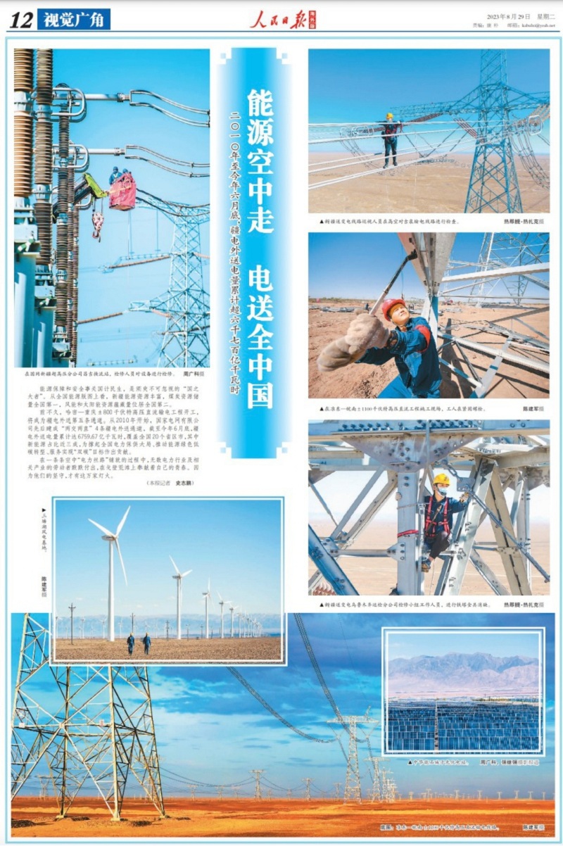 编者按:8月29日,《人民日报海外版》整版刊发《二〇一〇年至今年六月底,疆电外送电量累计超六千七百亿千瓦时——能源空中走 电送全中国》,图文并茂报道国家电网有限公司在新疆先后建成“两交两直”4条疆电外送通道,为撑起全国电力保供大局、推动能源绿色低碳转型、服务实现“双碳”目标作出贡献。
