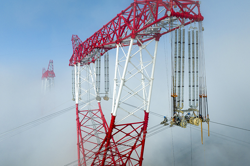 日前,江西省南昌县蒋巷镇的赣江南支流高空,安徽送变电工程有限公司施工人员在紧张架设武汉至南昌1000千伏特高压线路大跨越工程。整个工程建成后将进一步优化区域电网网架结构,支撑大规模绿色清洁能源的接入消纳,提升湖北与江西的省间电力互补互济能力。郑贤列 摄(影像中国)